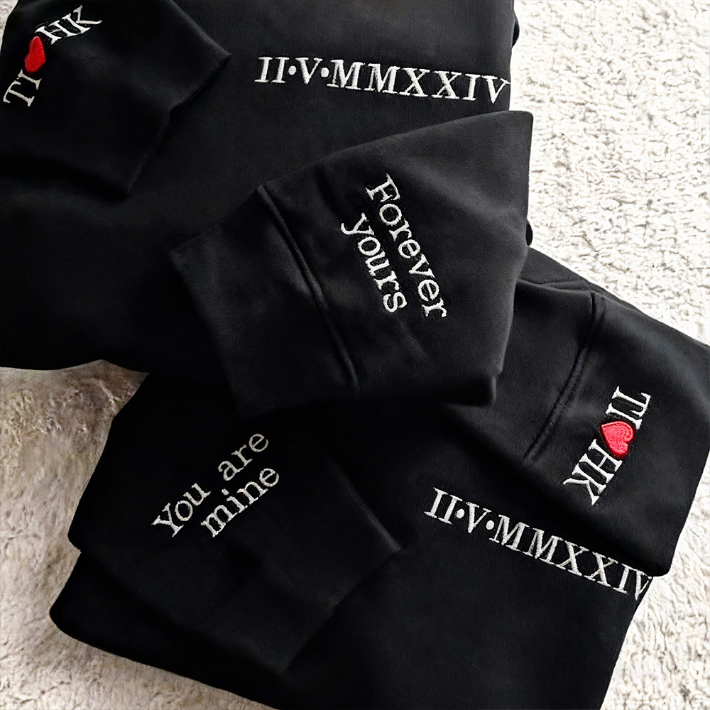 These embroidered couple hoodies feature your meaningful Roman date + sweet sleeve messages like “Forever yours” & “You are mine”.